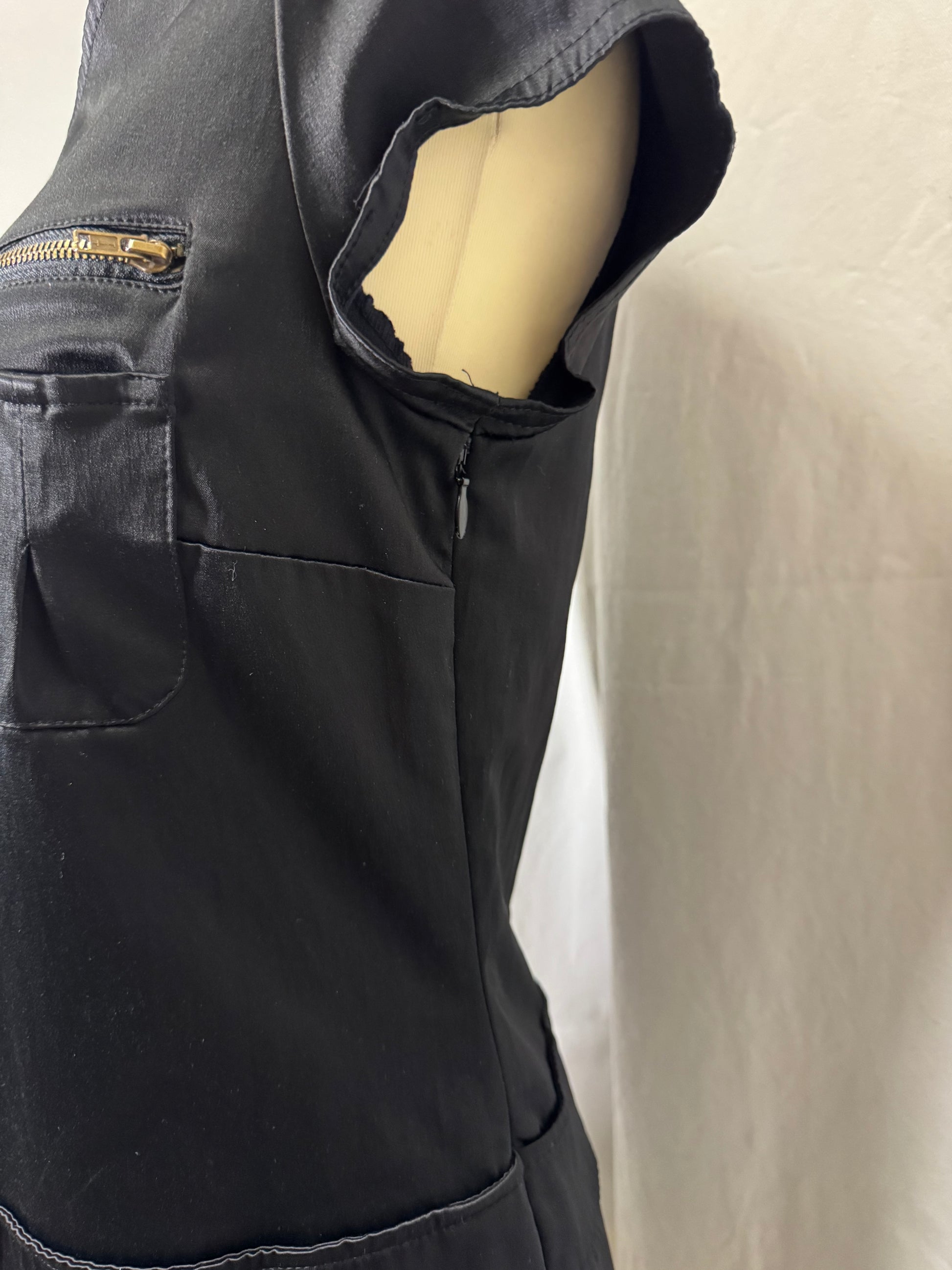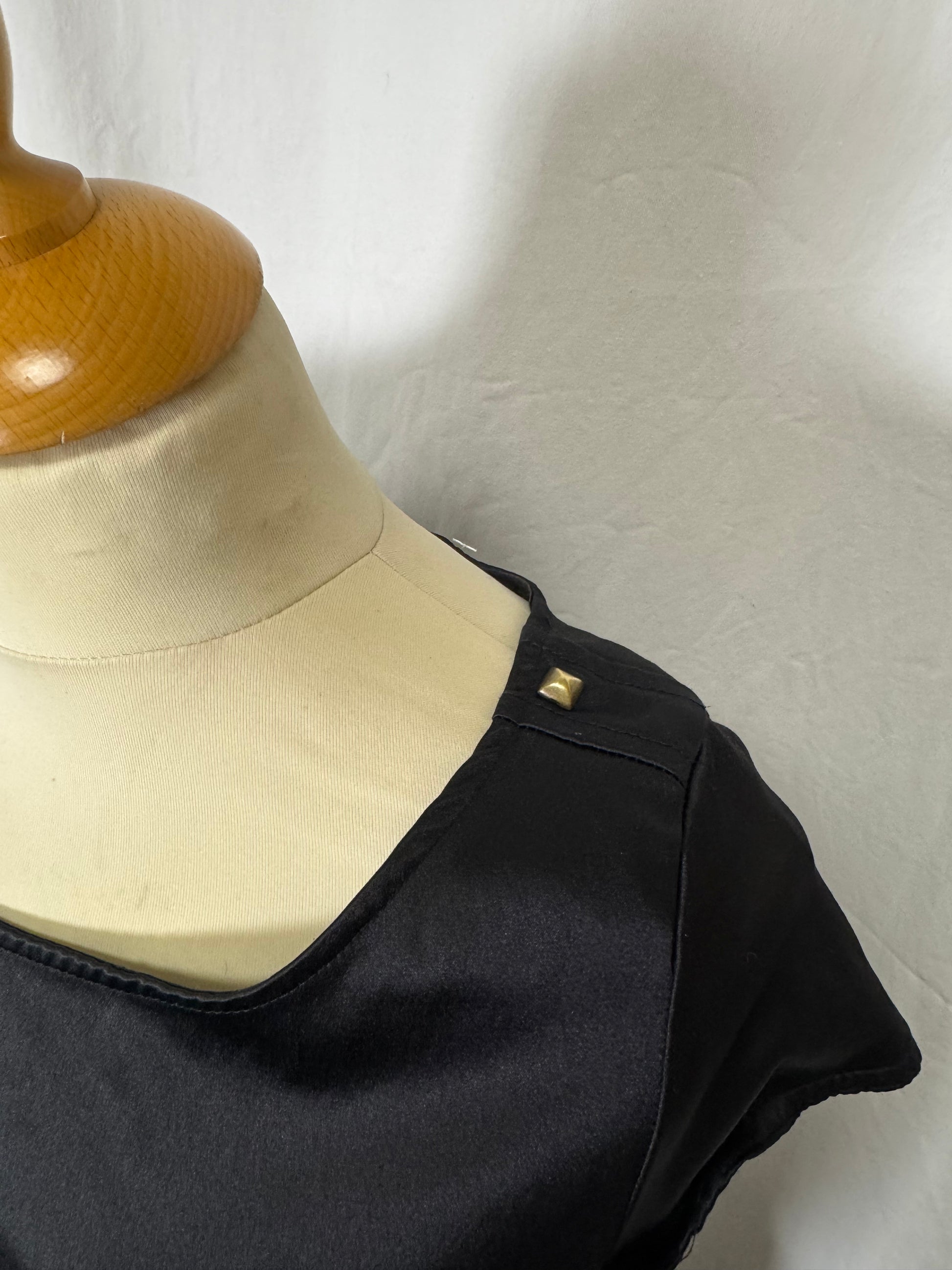Robe courte, noire satiné, effet ceinture intégré avec grosse boucle, deux poches et quatre fausses poches, détails métal doré.
