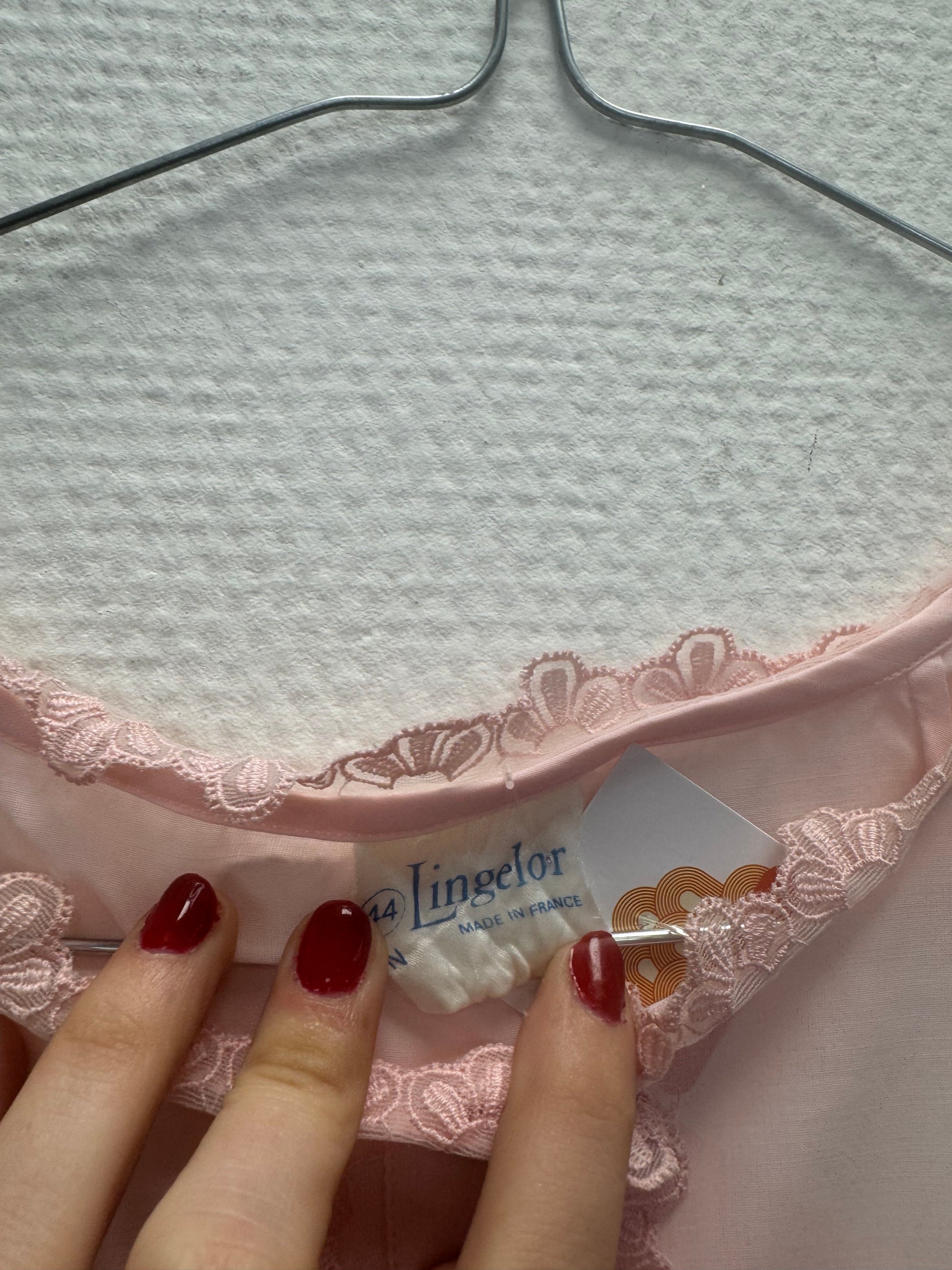 Robe de nuit rose, légèrement transparente, empiècement de dentelle à fleurs, trois boutons sur le col, col rond.
