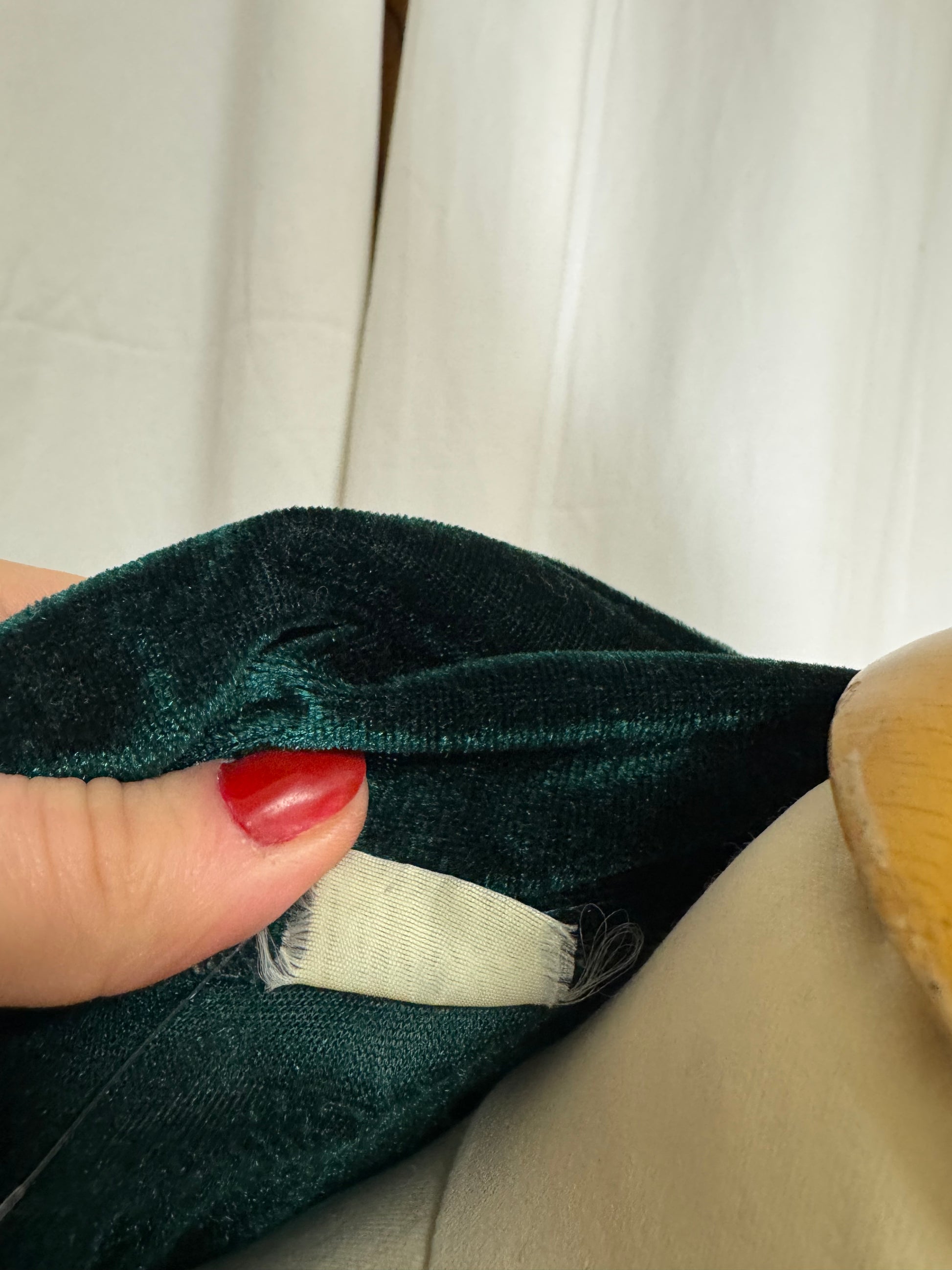 Robe de nuit en effet velours vert, broderie sur le haut, trois boutons.