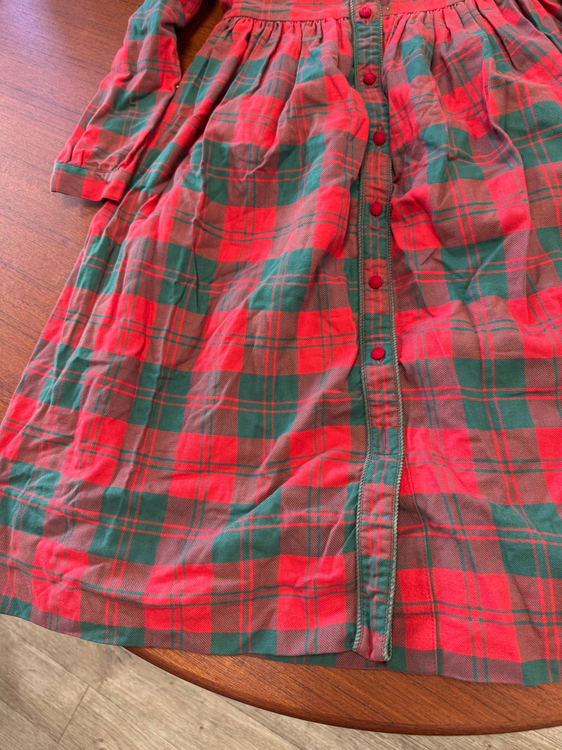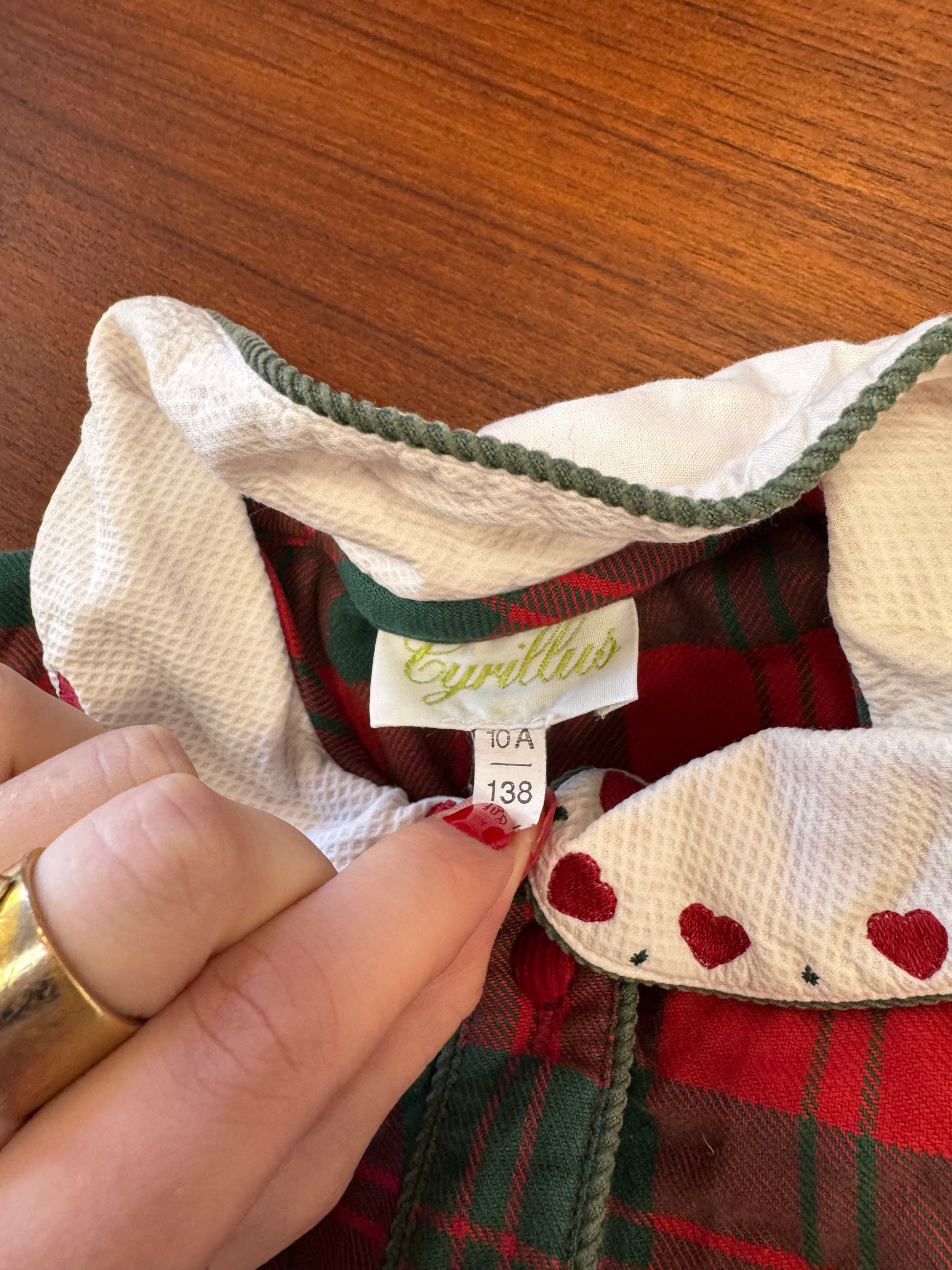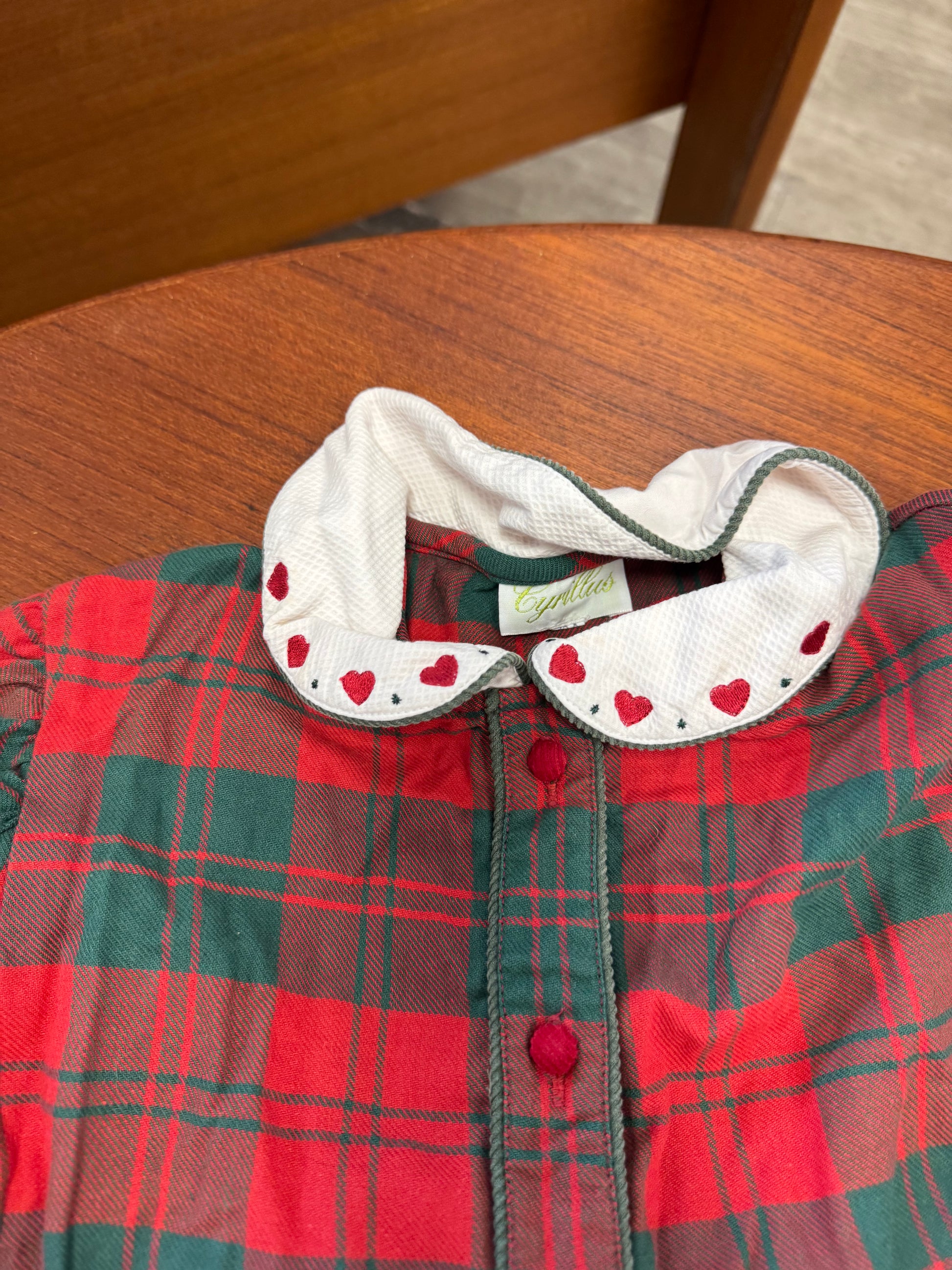 Robe longue, manches longues, écossaise rouge et verte, col claudine brodé avec des coeur, entièrement boutonnée, ceinture dans le dos.