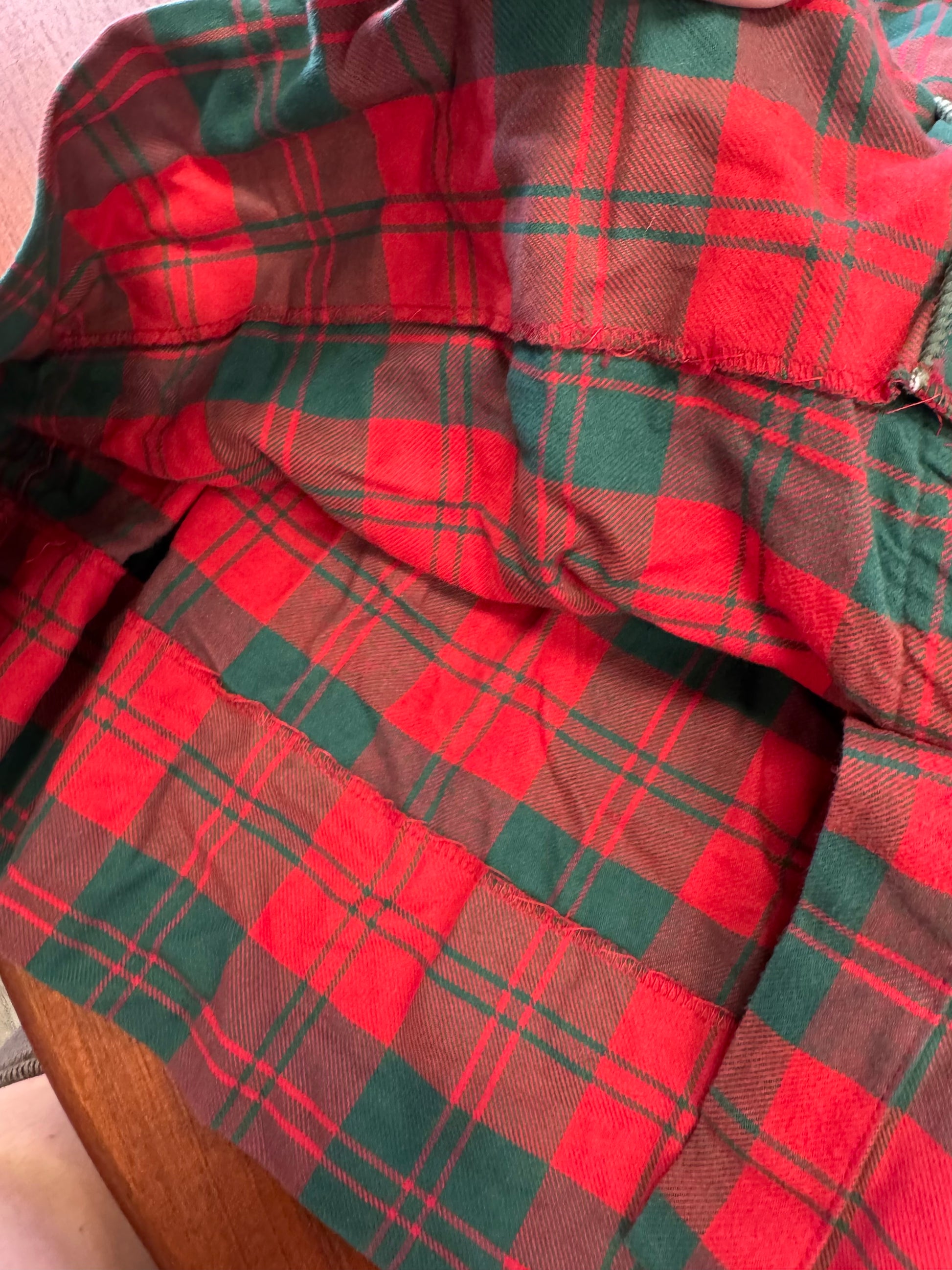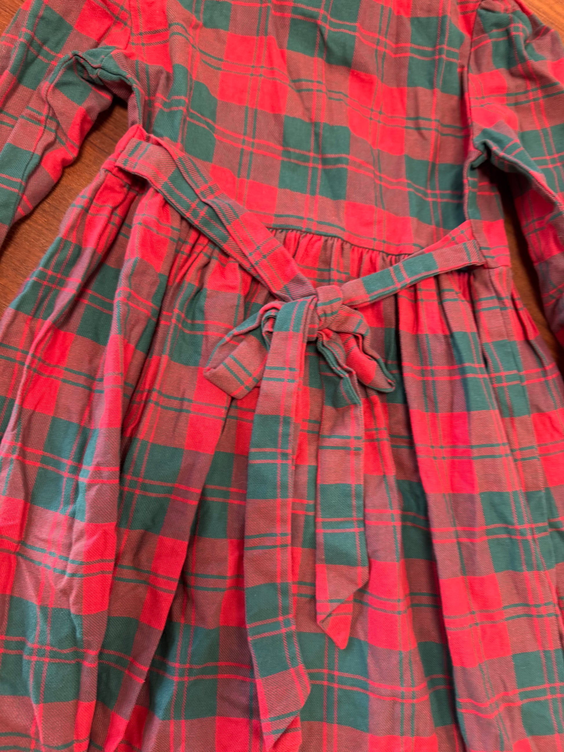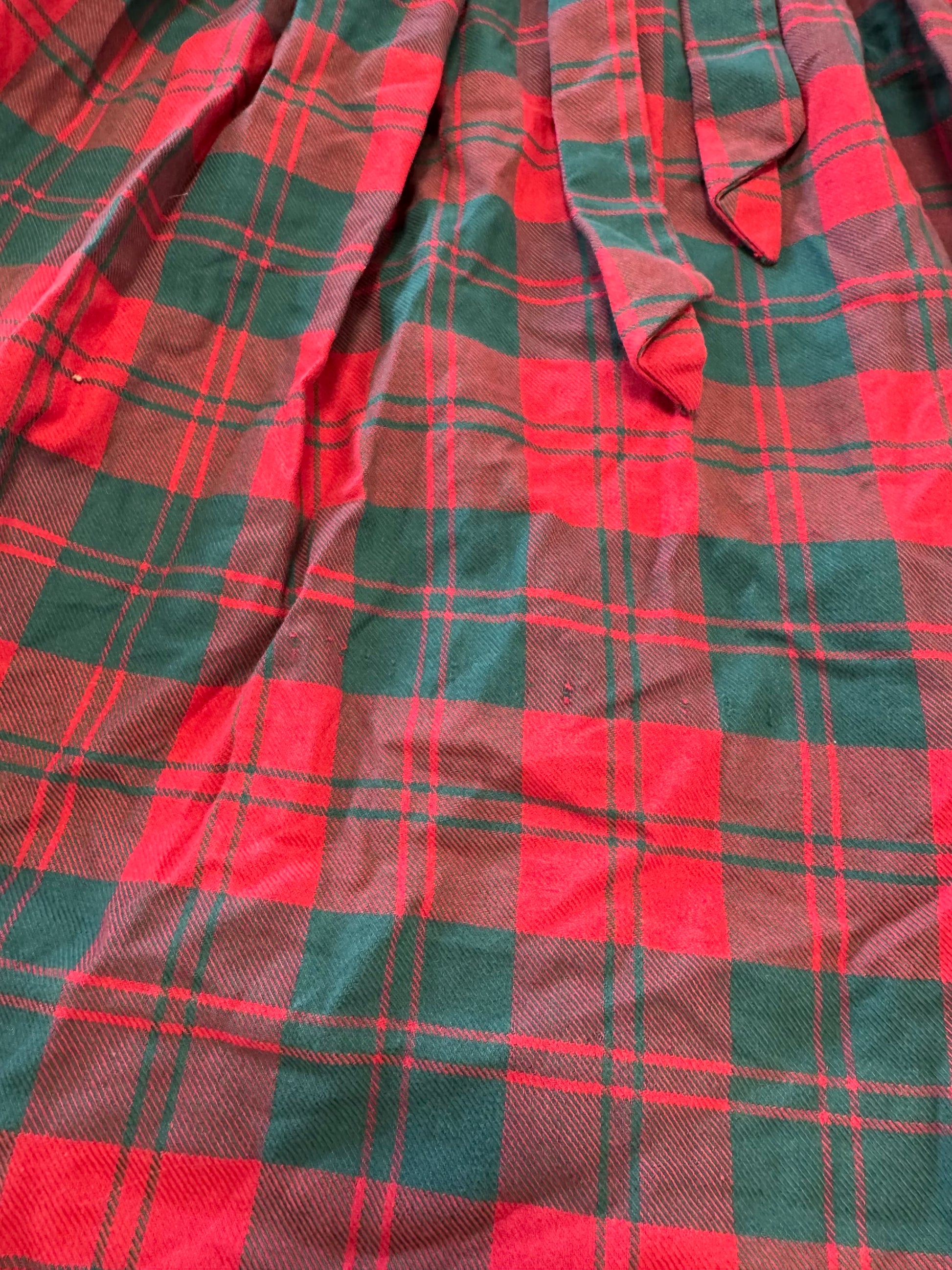 Robe longue, manches longues, écossaise rouge et verte, col claudine brodé avec des coeur, entièrement boutonnée, ceinture dans le dos.