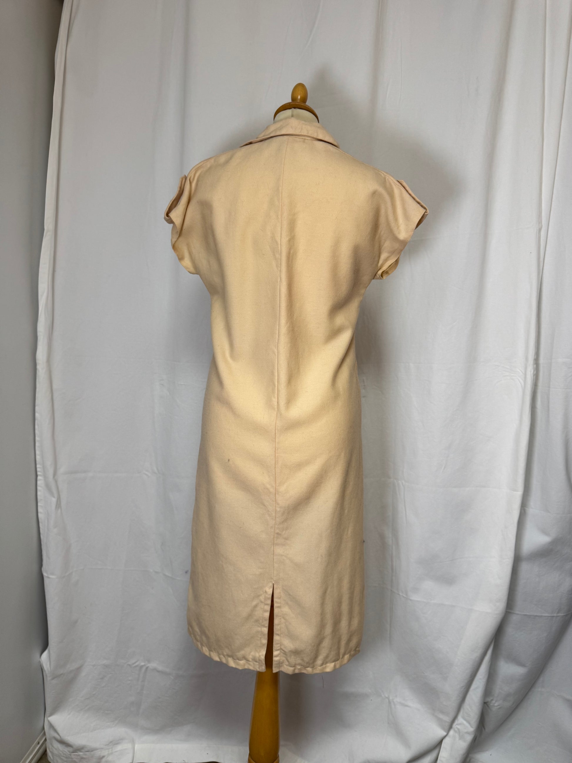 Robe longue beige, décolleté en v, manche courte, deux poches, coupe droite, fente à l'avant sur le dos et à l'avant.