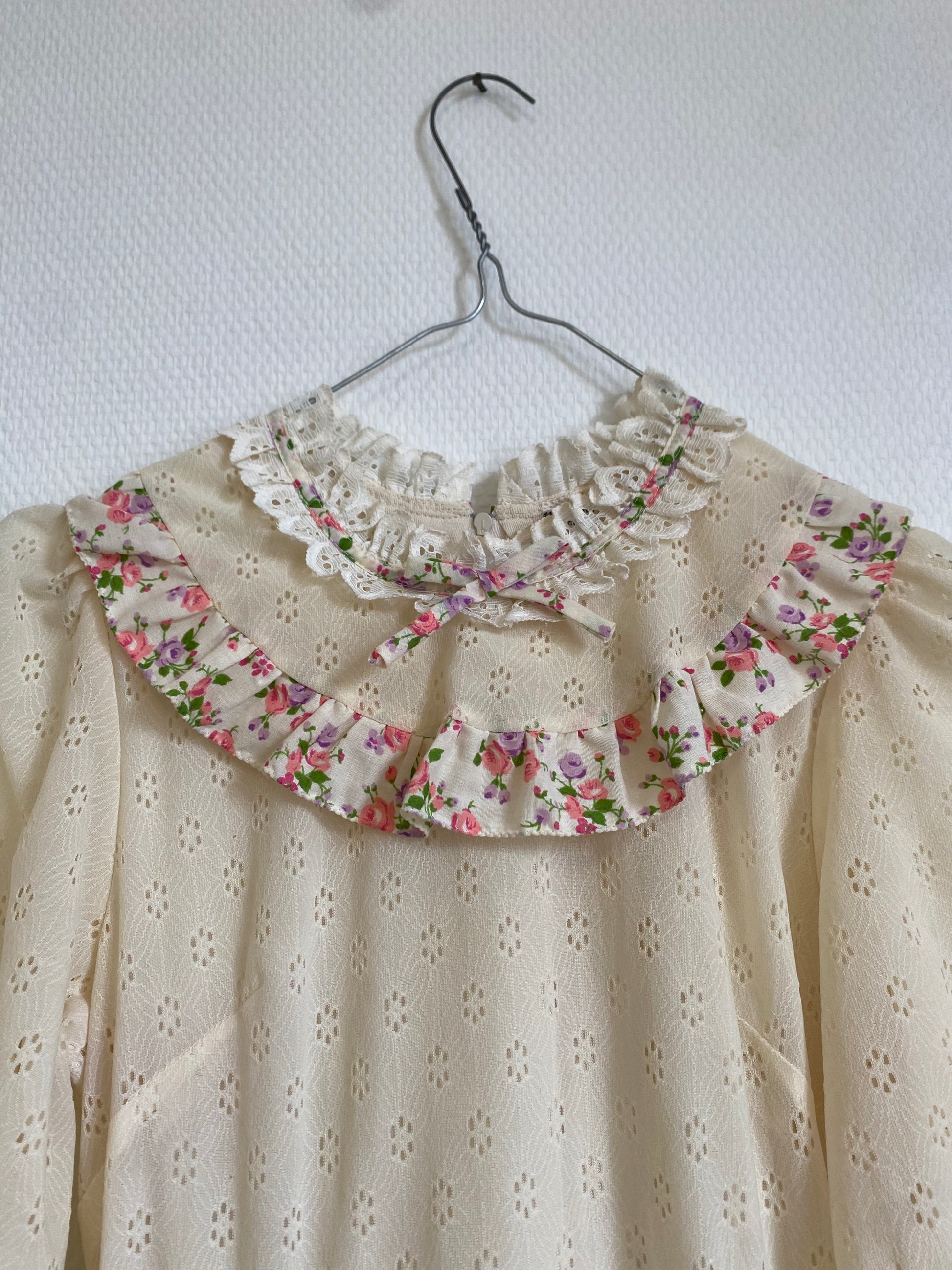 Robe maxi des années 70, manche courte, haut en broderie ajourée beige, jupe à fleurs dans les tons rose sur fond beige, fermeture éclair dans le dos, ceinture assortie.