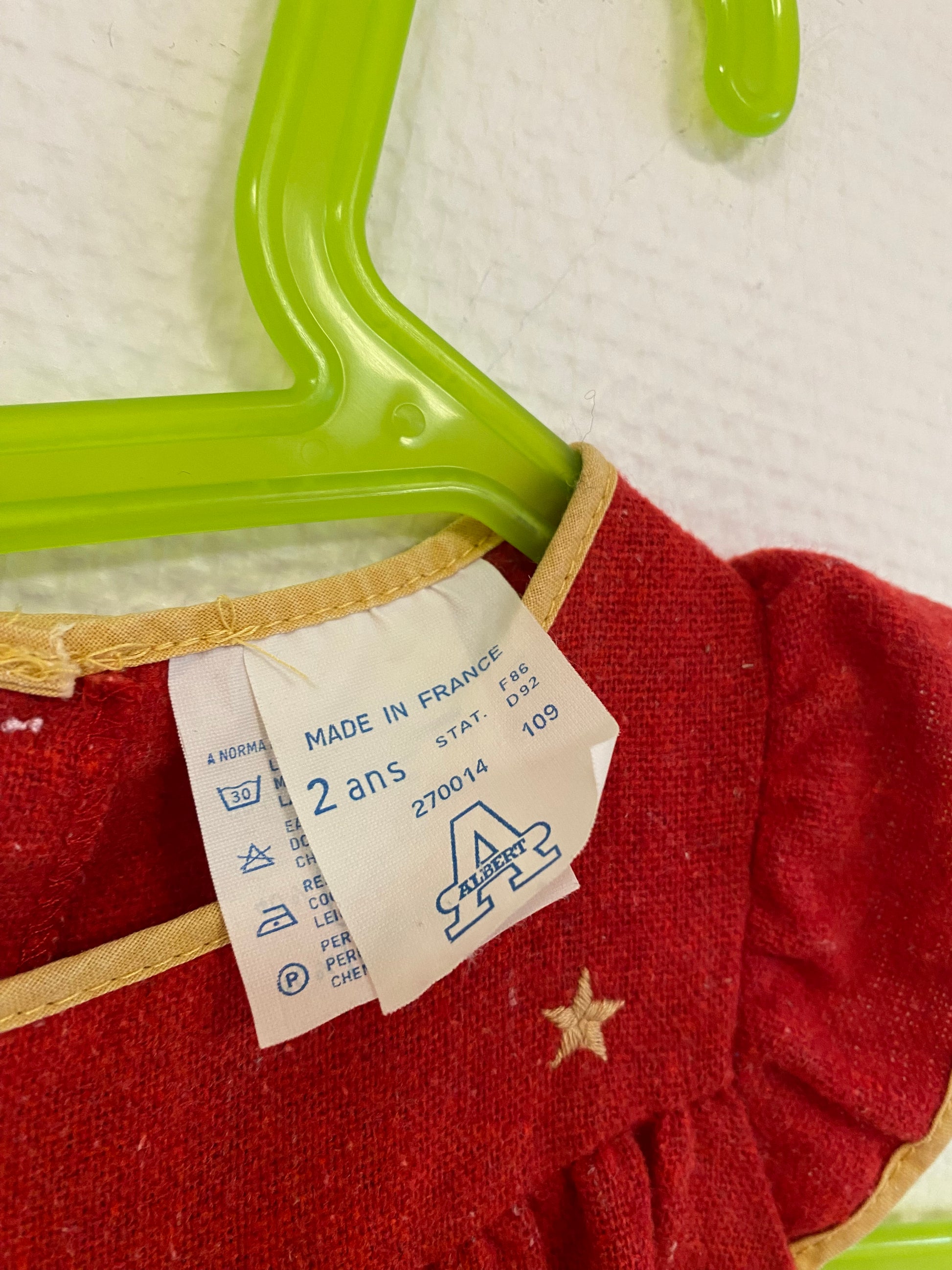 Robe sans manche rouge, broderie étoile jaune, col rond, boutons dans le dos, made in france.
