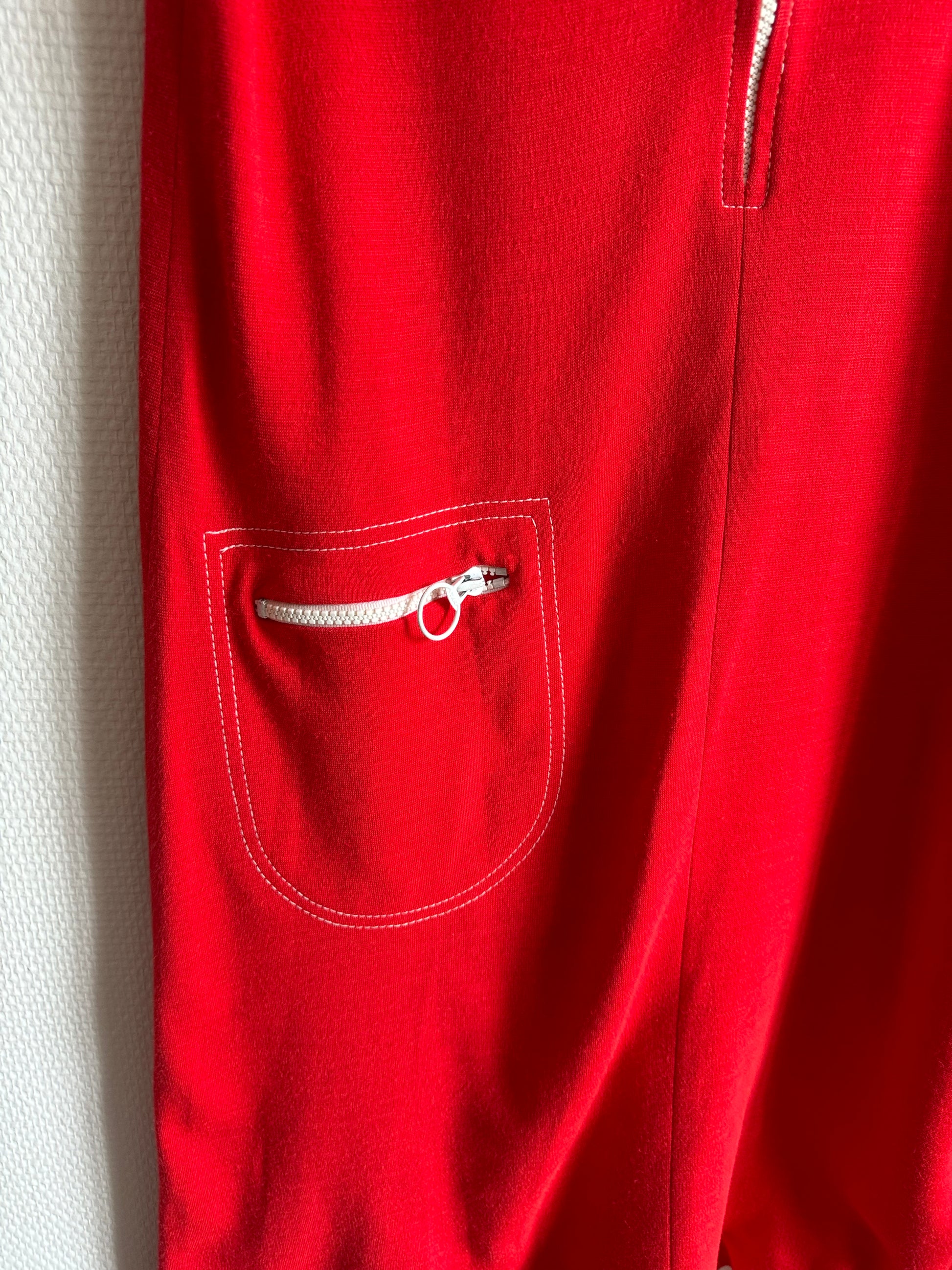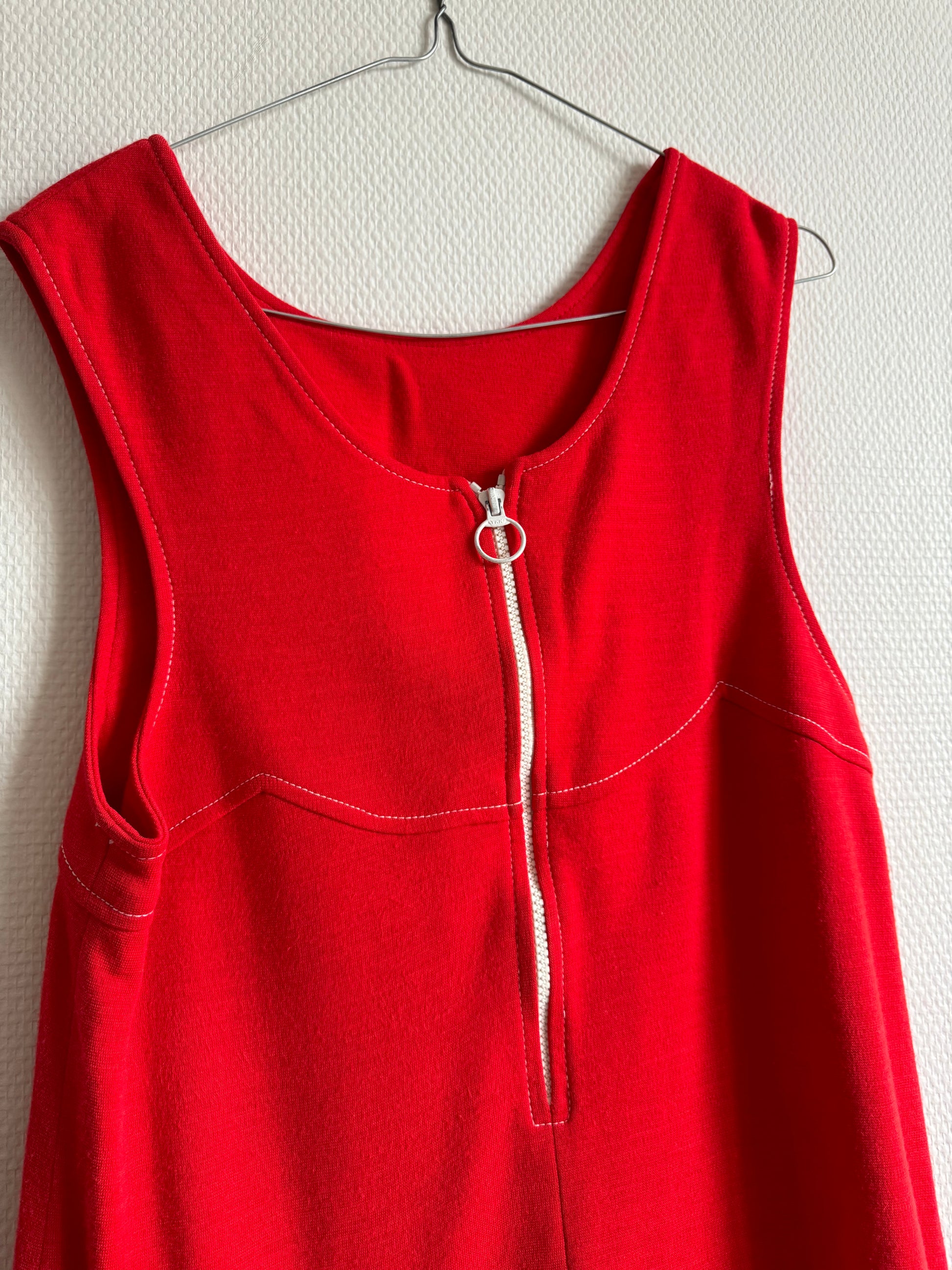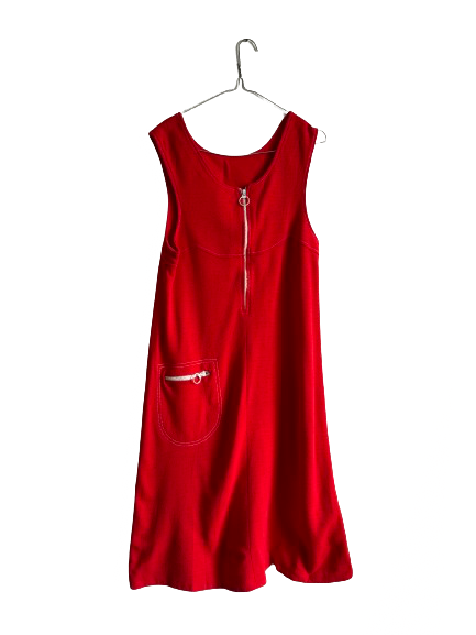 Robe mi longue rouge des années 60, sans manche, surpiqure blanche, fermeture écalrii blanche, une poche.