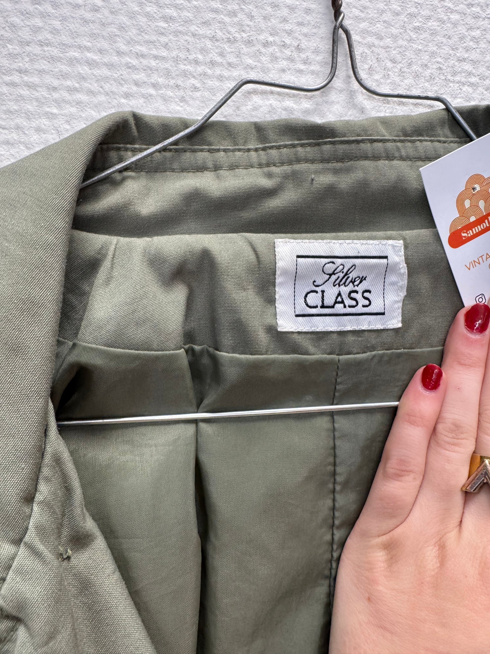 Trench mi long, vert kaki, double boutonnage, deux poches, ceinture assortie, petite fente dans le dos, un bouton de rechange à l'intérieur.