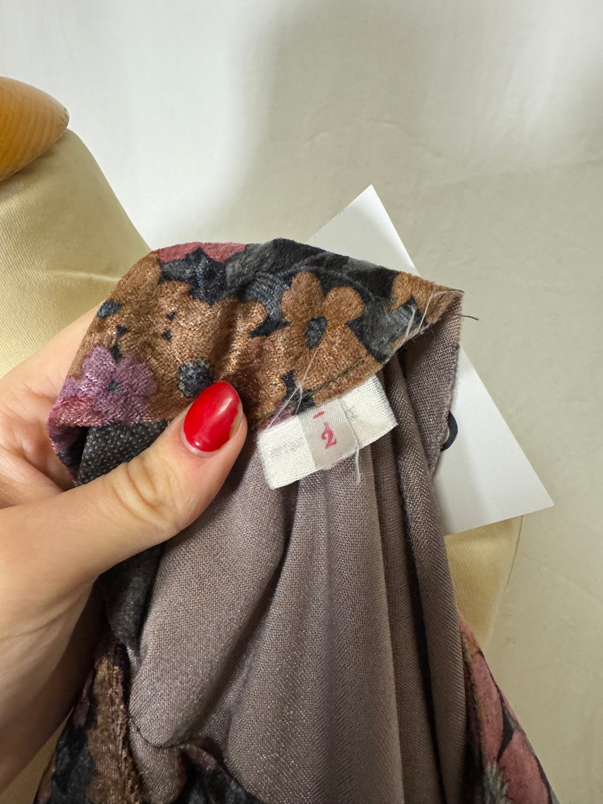 Veste légère en velours, imprimé fleuri tons violet, deux fausses poches, col rond.