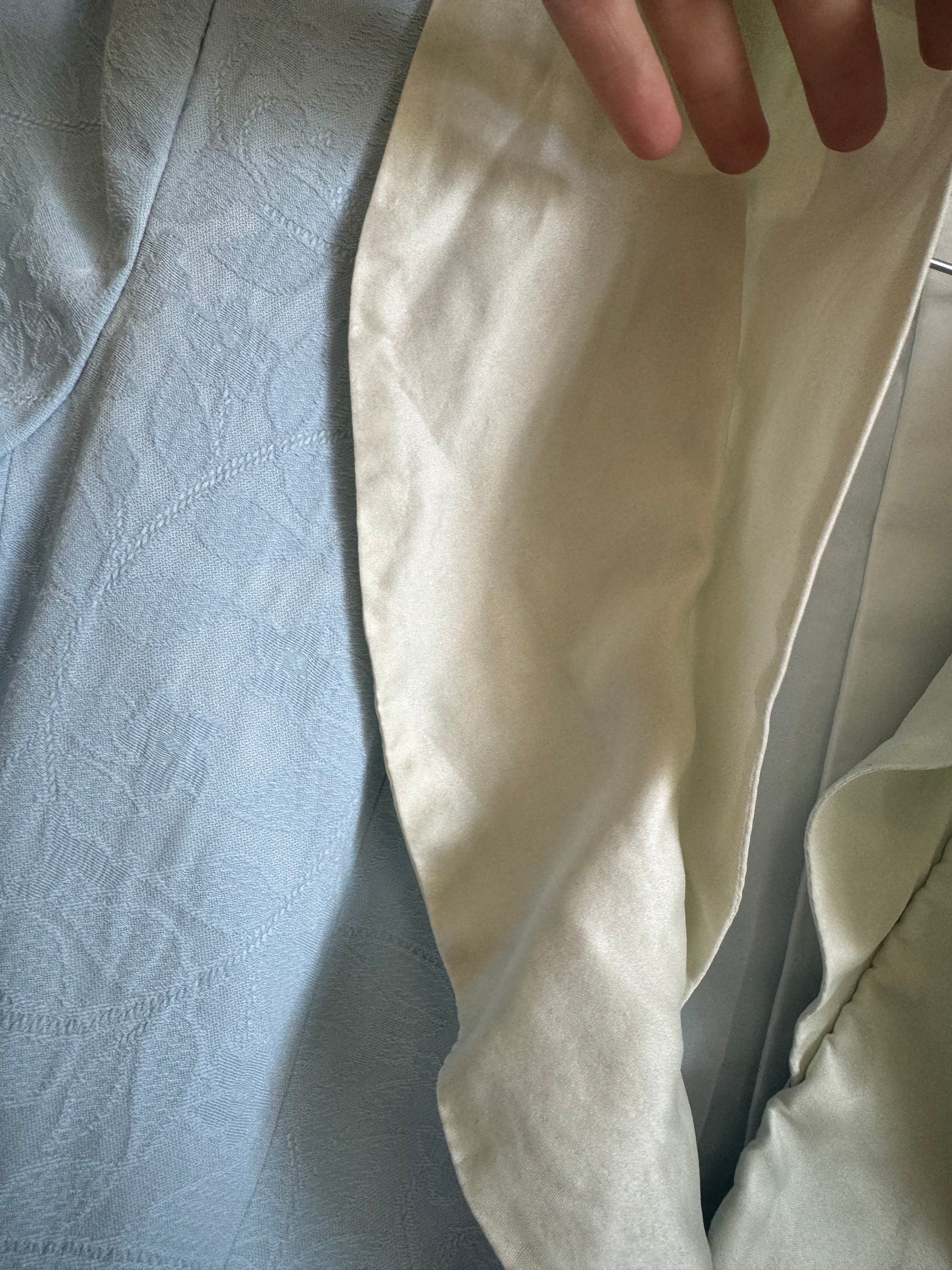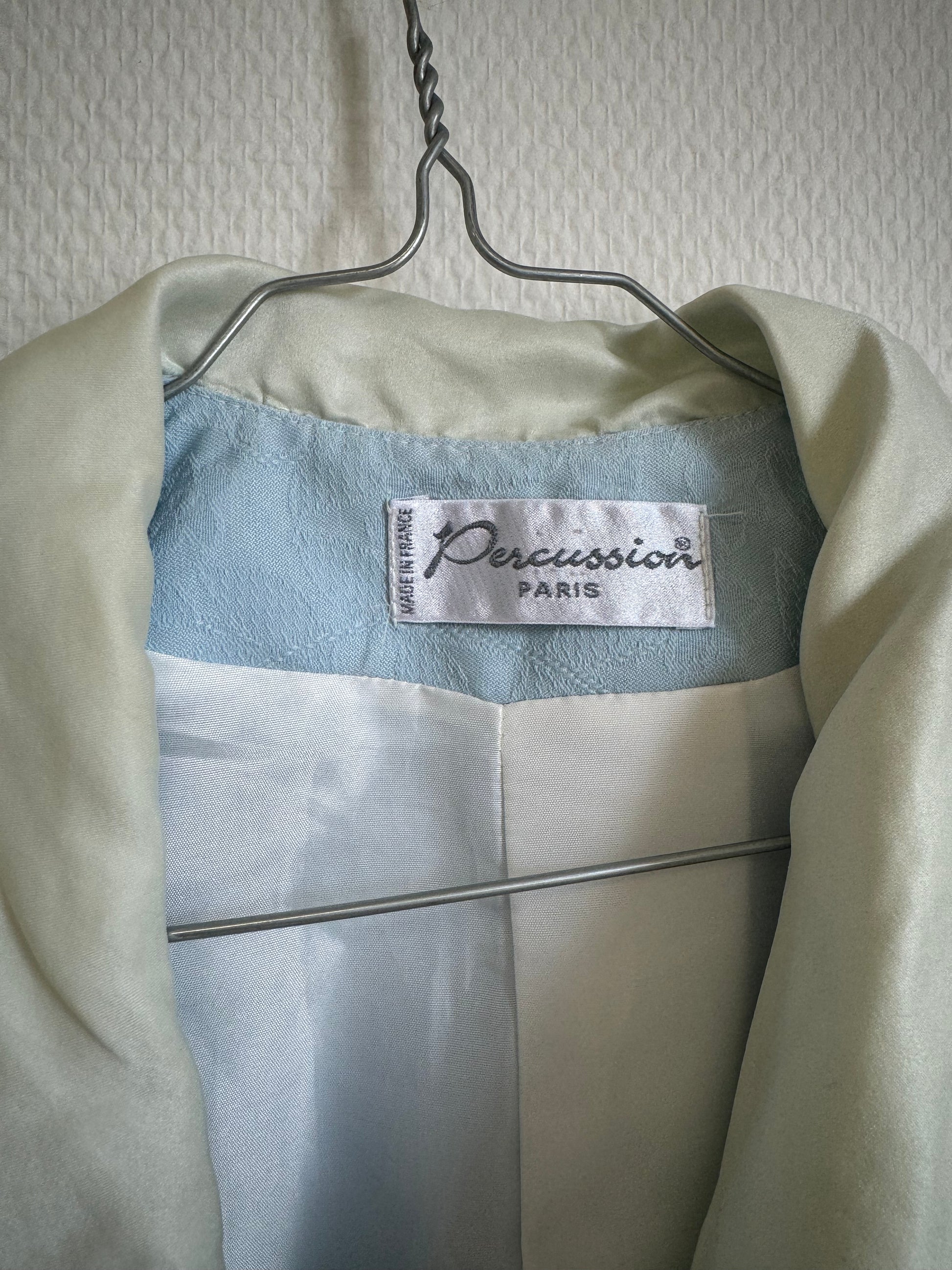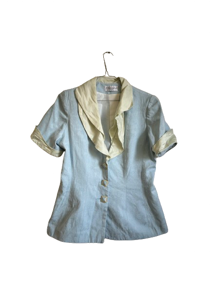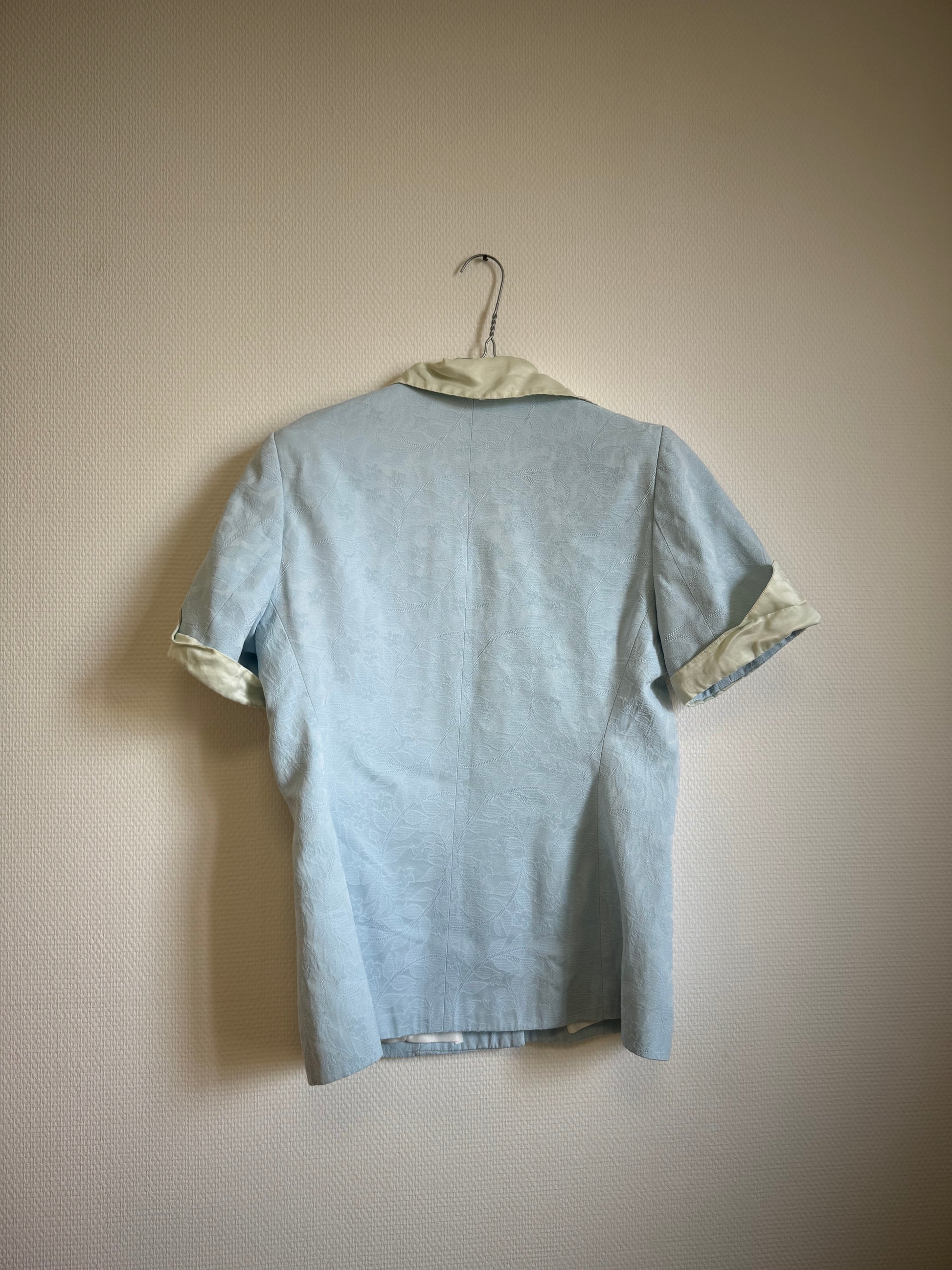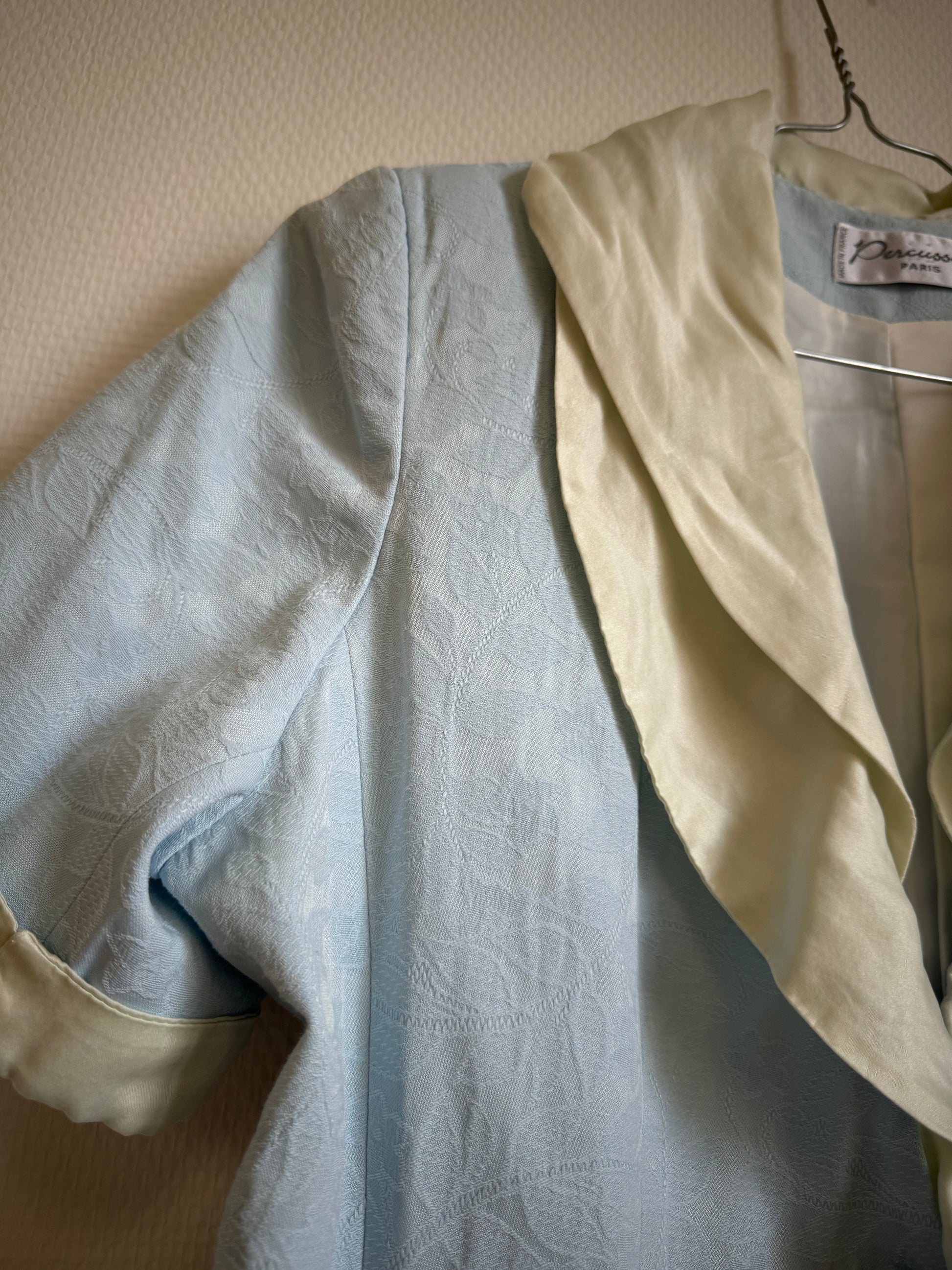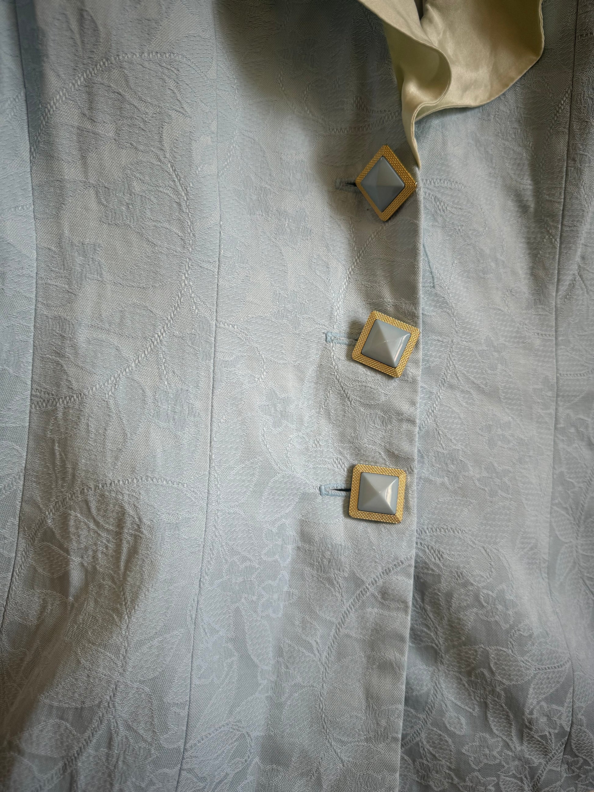 Veste bleu brodée, motifs floraux, fermeture par trois boutons doré et bleu.