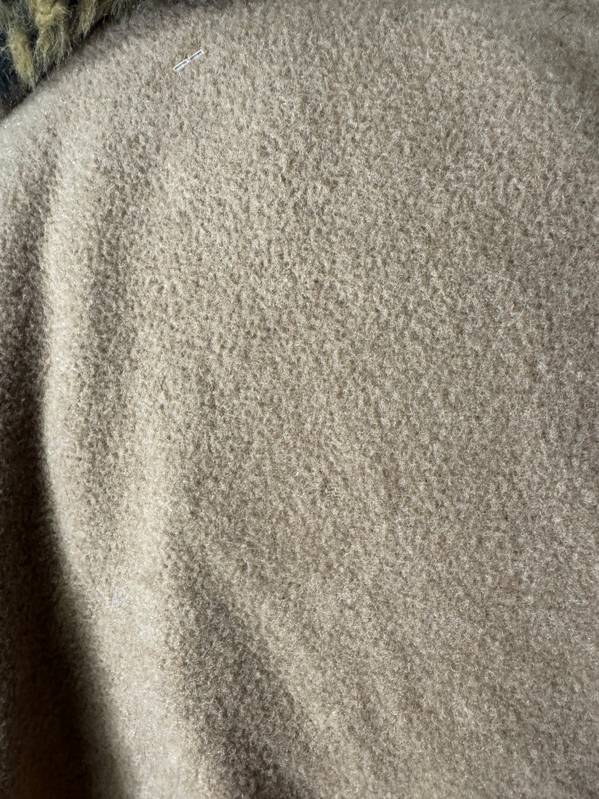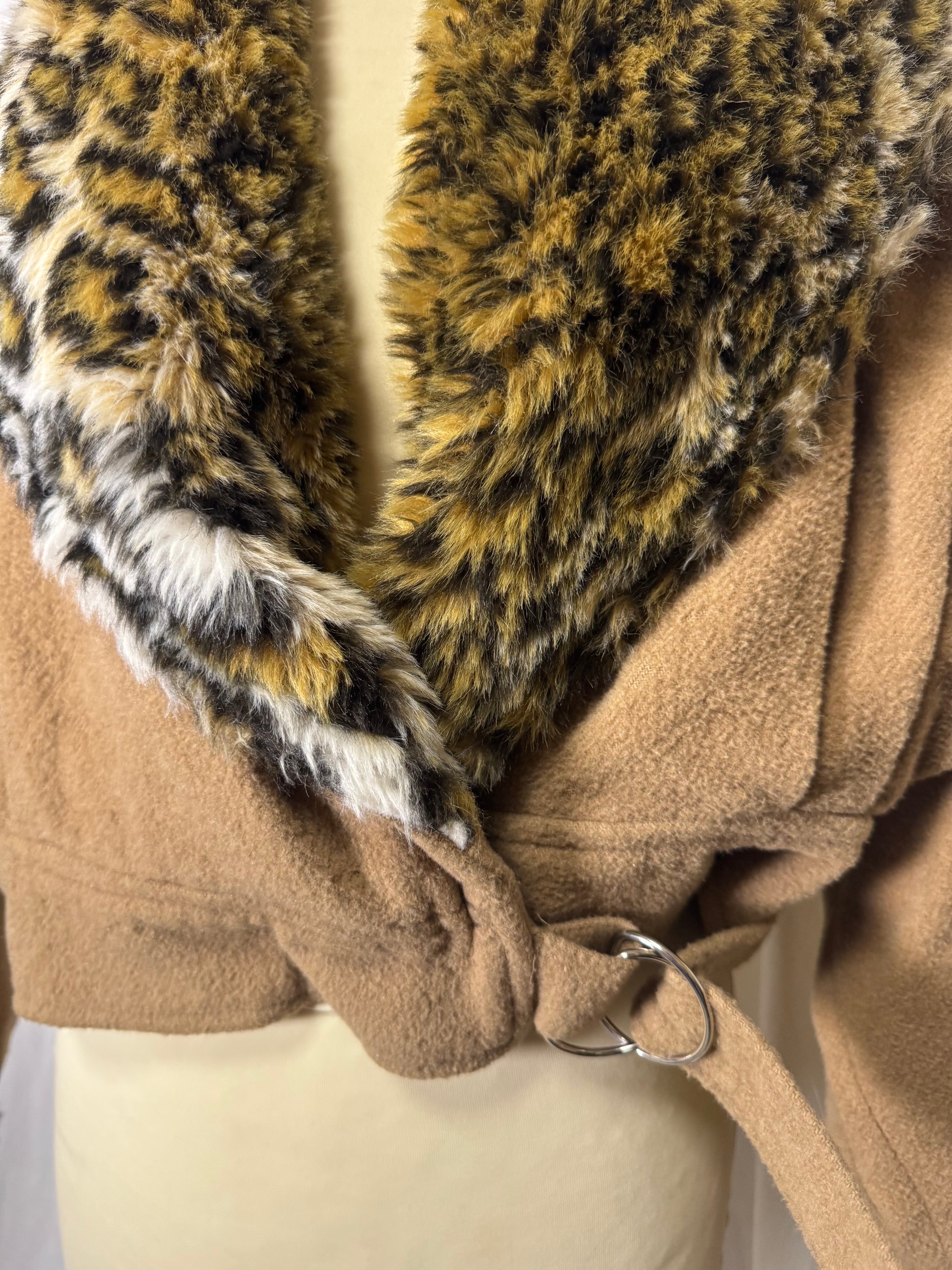Veste courte marron, grand col en fausse fourrure léopard, fermeture par une ceinture sur le bas.