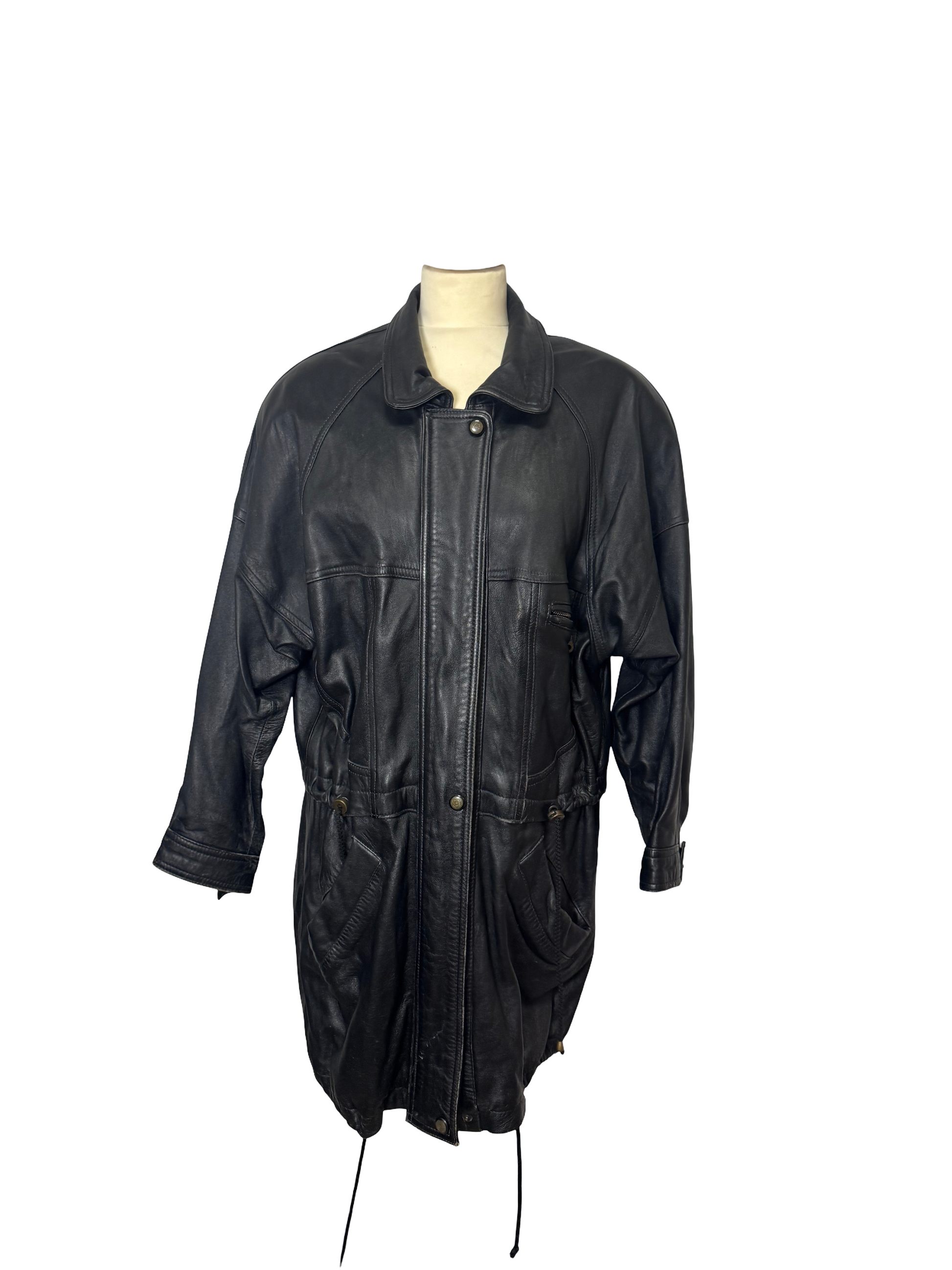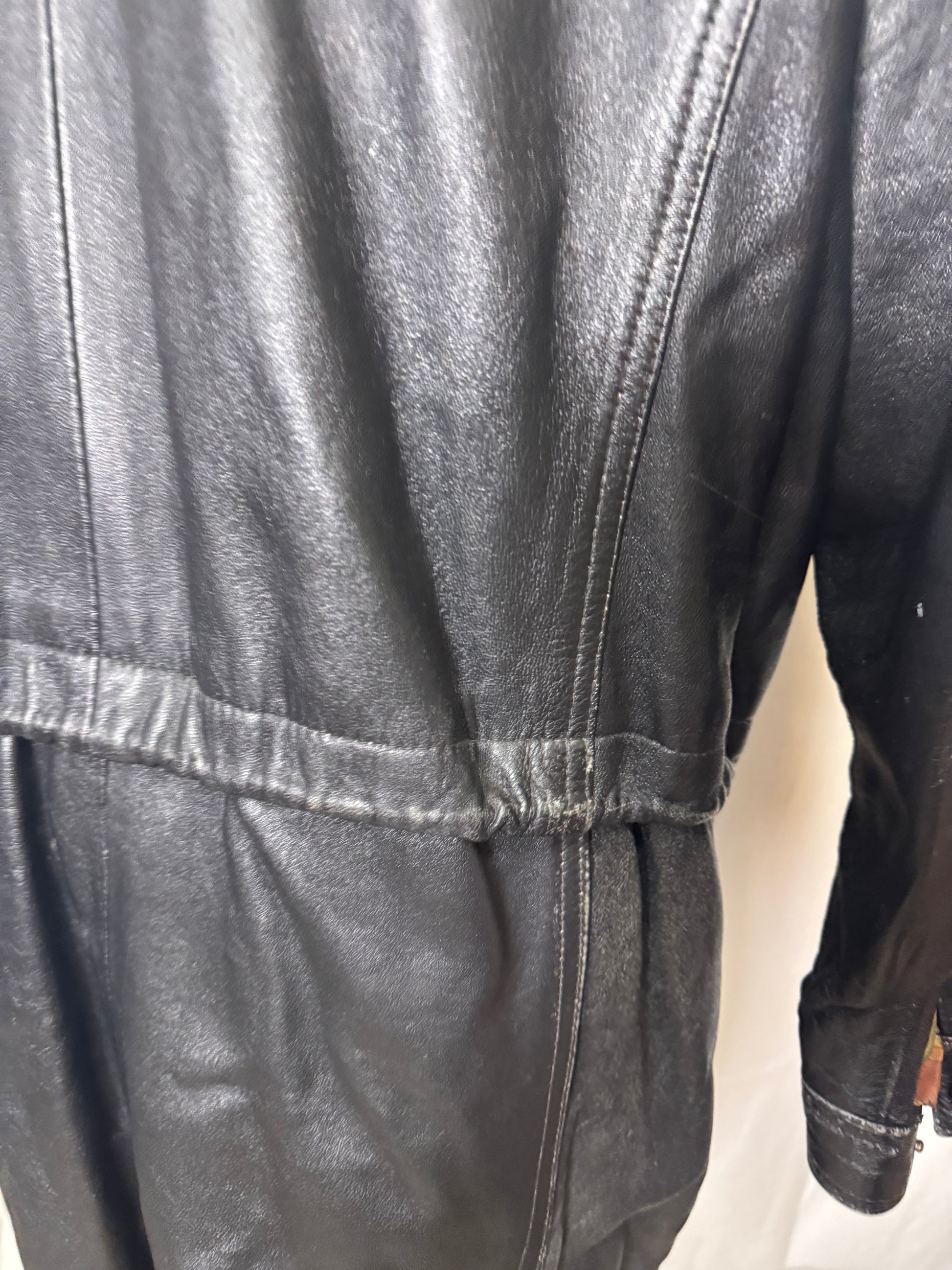 Veste mi longue en cuir noir des années 80, lien de serrage à la taille, trois poches