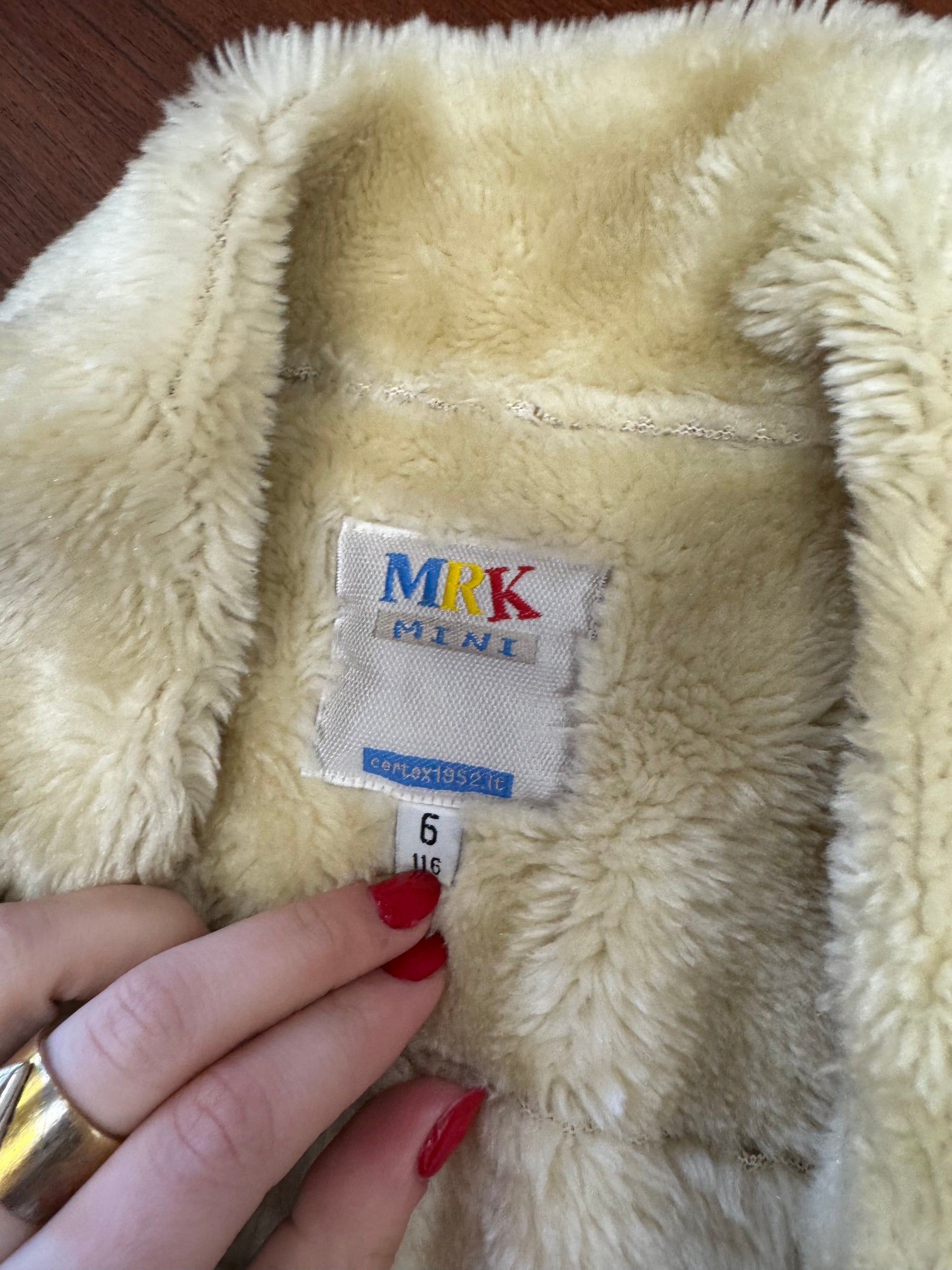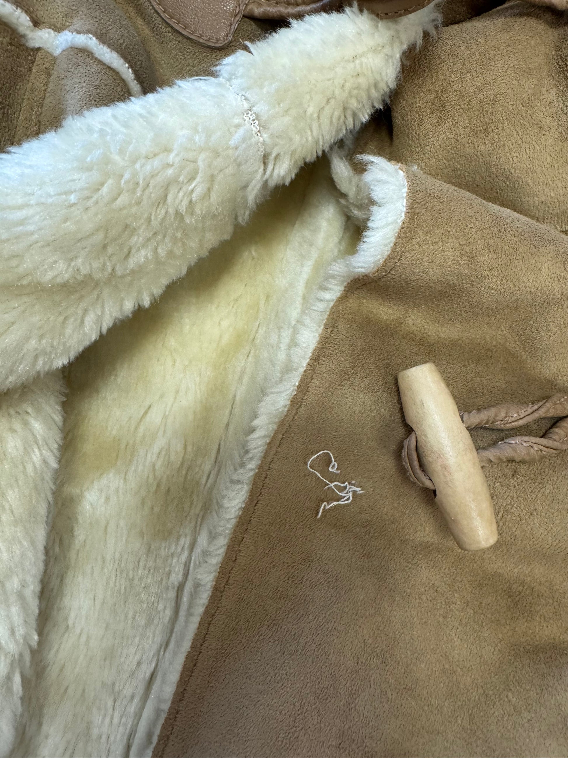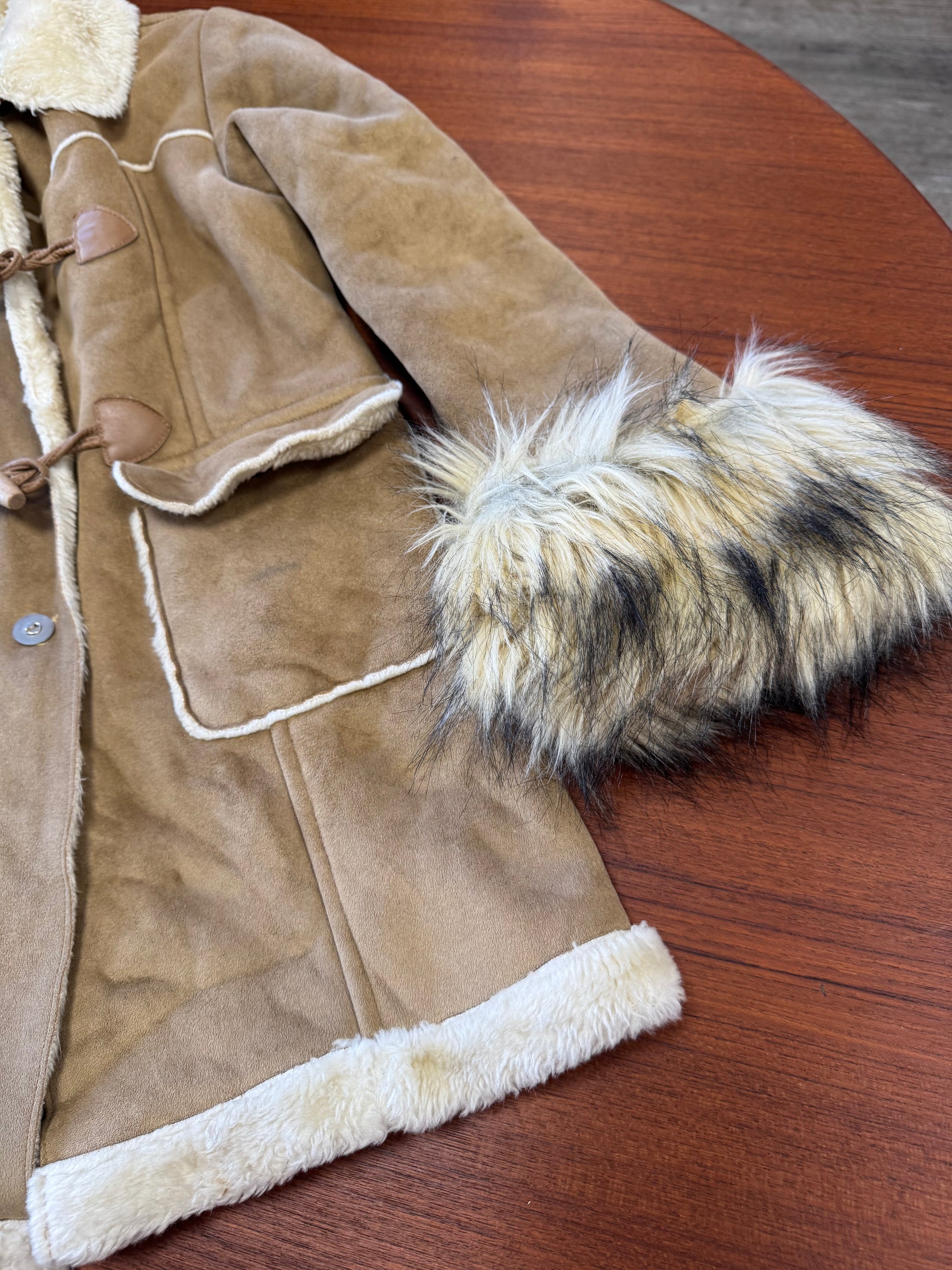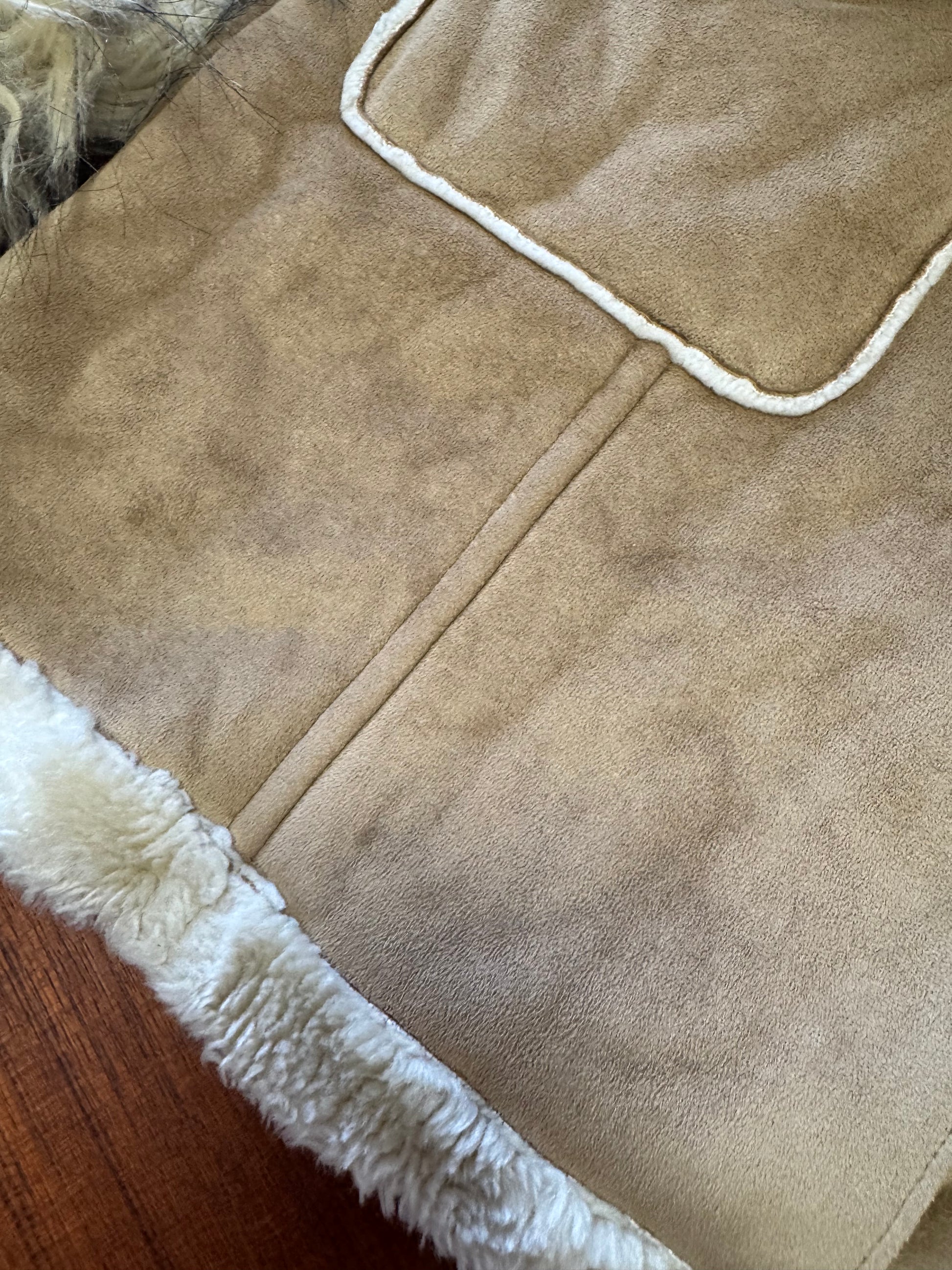 Veste mi longue, effet peau retournée, en fausse fourrure beige et marron, deux poches.