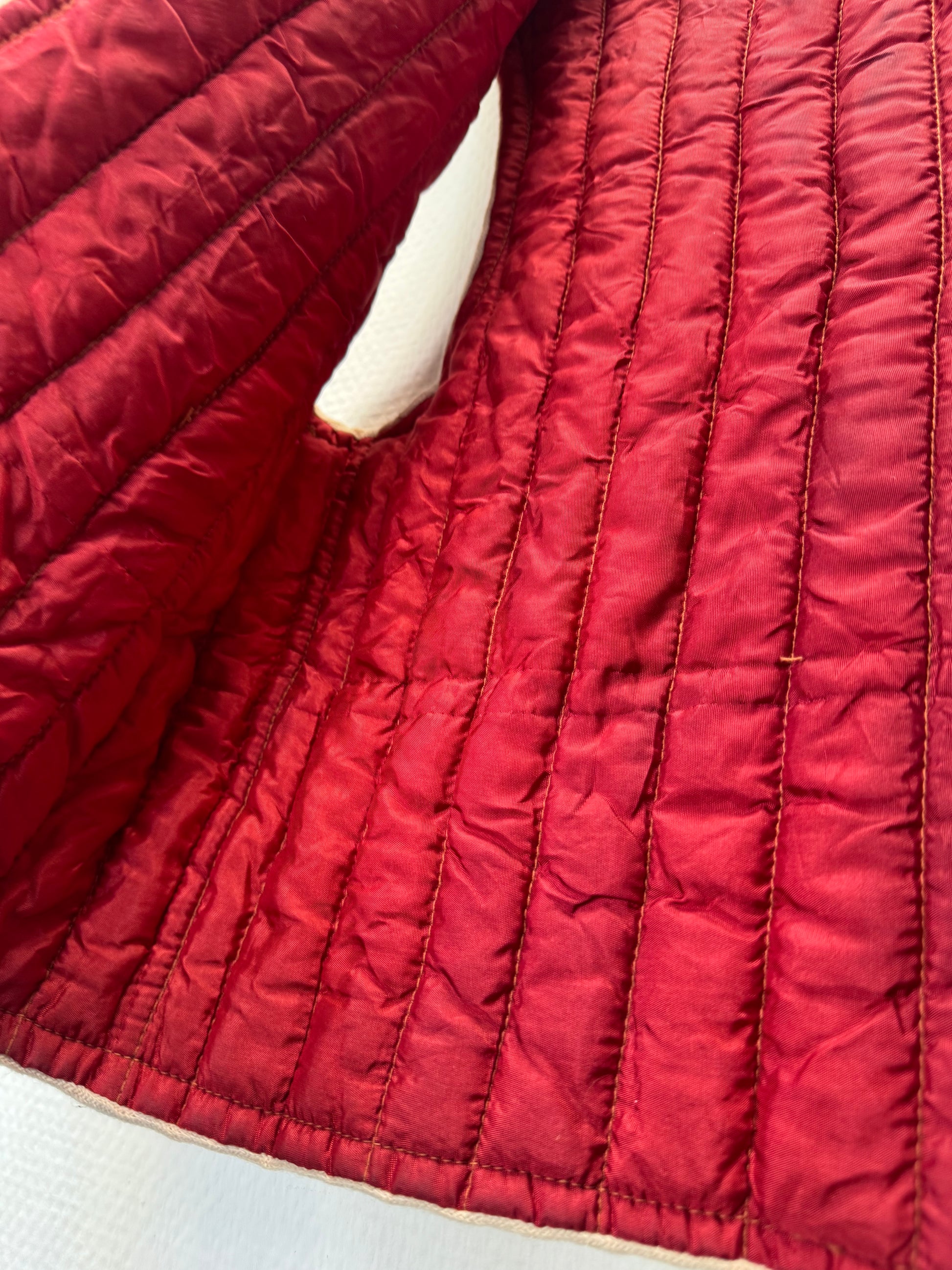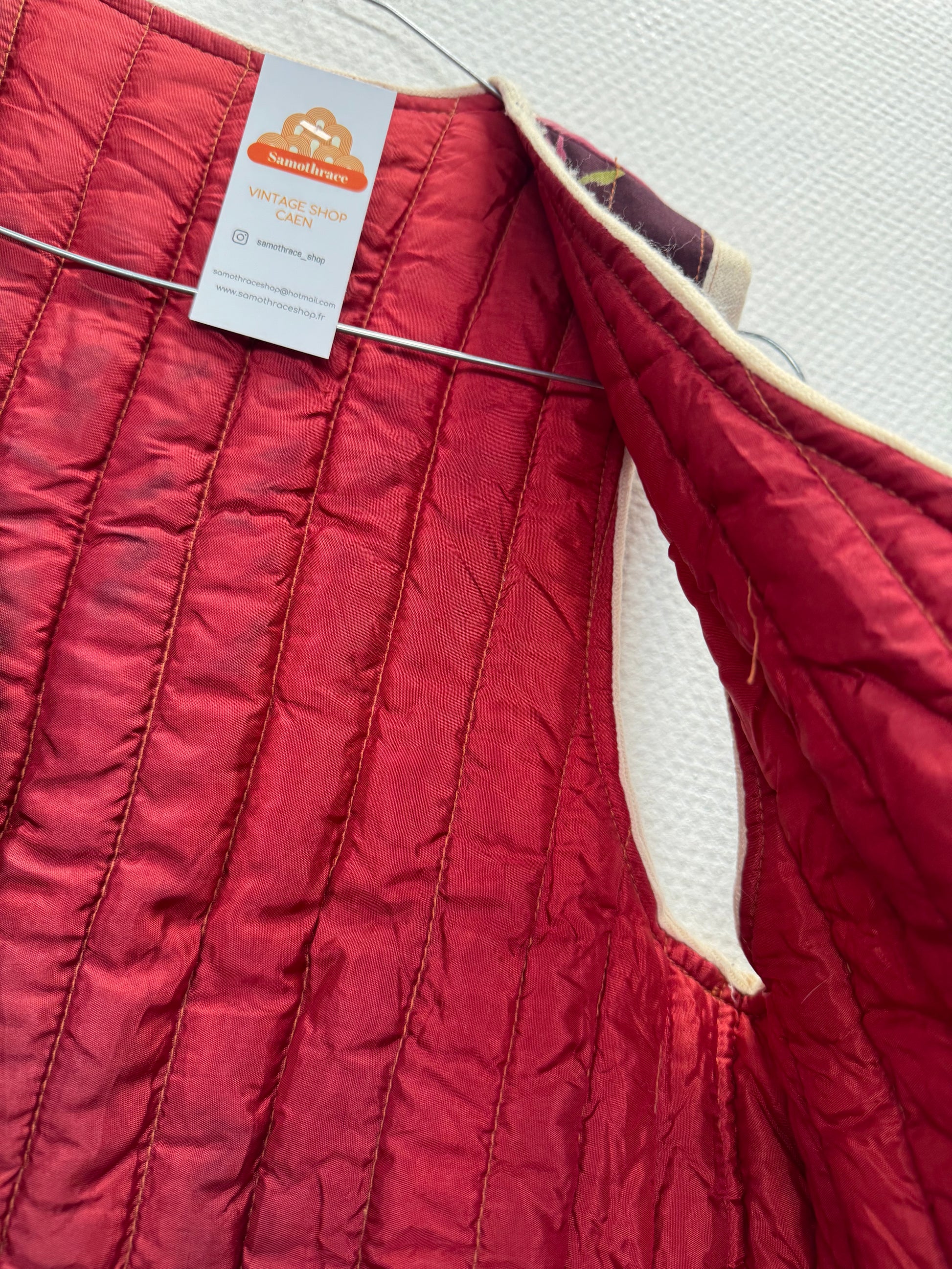 Veston à fleurs bordeaux, matelassé, sans manche, pas de fermeture.